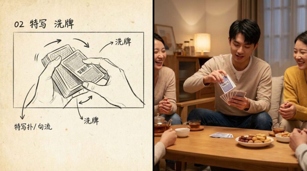 | 02 | 特写 | 手指快速洗牌,扑克顺滑无卡顿 | 清脆洗牌声 | 2 秒 |